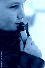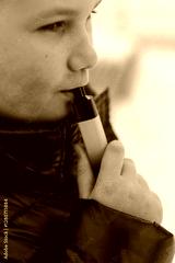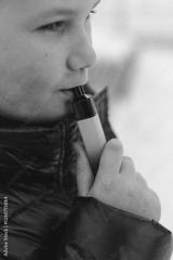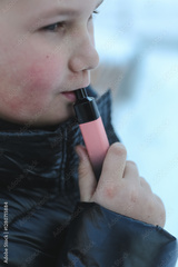 an eleven year old child tries a nicotine-free disposable cigarette on a city street