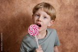 Portrait of a boy biting a colorful lollipop on a light brown background