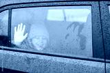 Child smiling and waving through foggy car window on a rainy day, captured with condensation and water droplets. The child wears a yellow hat, adding contrast to the dreary weather