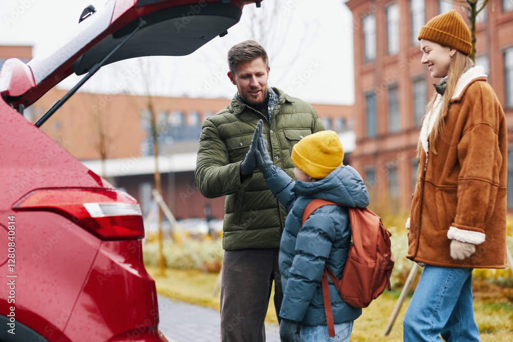 Family seen preparing for school, with father, mother, and child interacting near their vehicle. Boy wearing backpack, cheerfully engaging with parents during morning routine