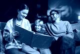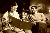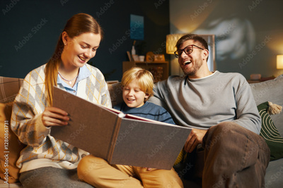 Smiling family spending quality time together on cozy couch while reading book and laughing, warm lighting creating an inviting and relaxed atmosphere in living room