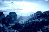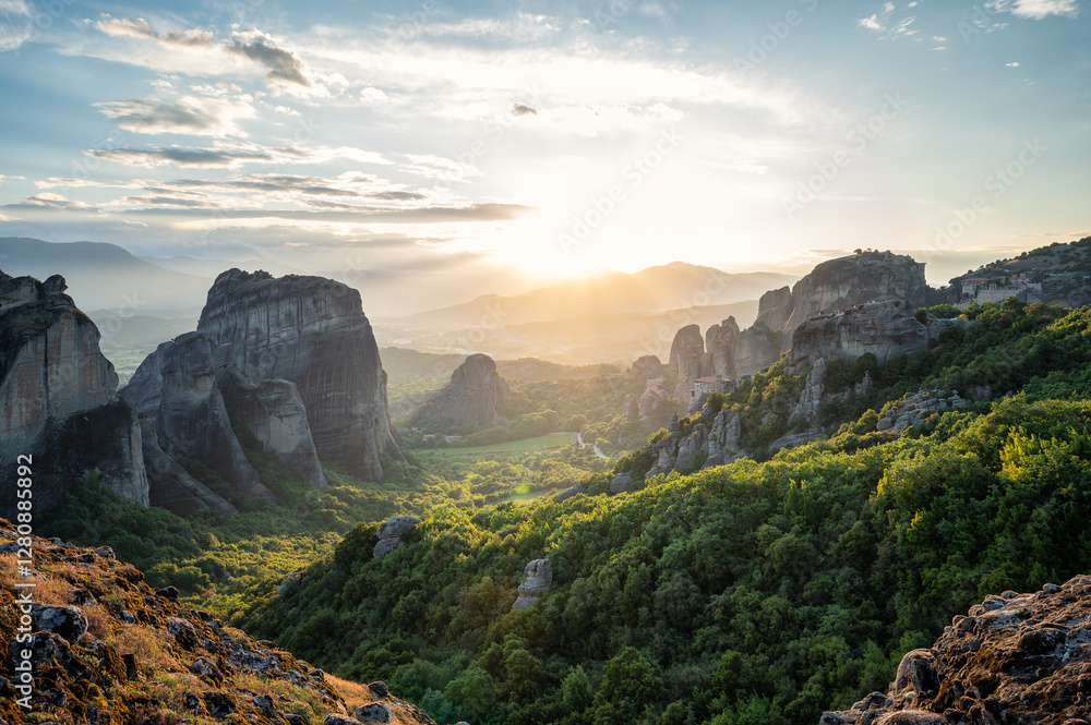 Amazing panoramic view of the Meteora valley with the monasteries in the golden hour of the sunset against the background of the setting sun, near Kastraki, Greece.