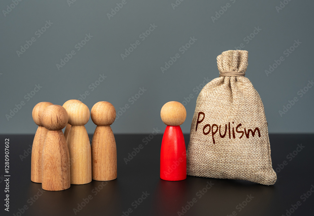 The red man offers the audience a bag of Populism. The concept of dishonest politicians leading populist agitation. Propaganda. Misleading promises, mass manipulation, and political deception.