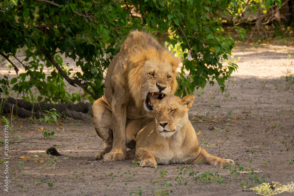 Male lion mates with female biting ear