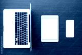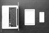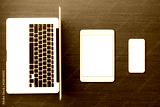 aptop tablet and phone on desk top view, mock-up tablet and phon