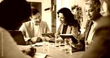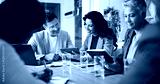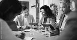 Meeting, technology and business people in office for finance investment with company with online. Collaboration, discussion and financial management team with profit or revenue margin report.