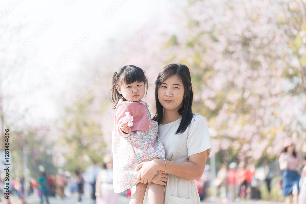 Smiley parent and child,Asian mother and daughter walking in a park with cherry trees.