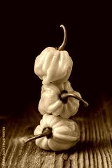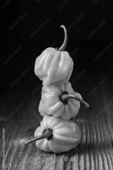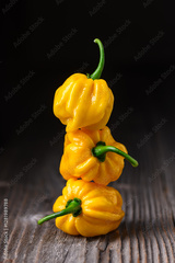 Three ripened yellow habanero peppers (capsicum chinense) on wooden table. Very hot mexican peppers on rustic wooden table close up