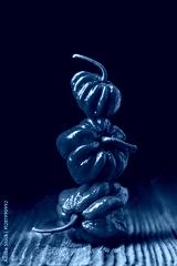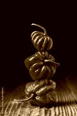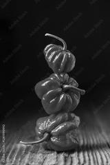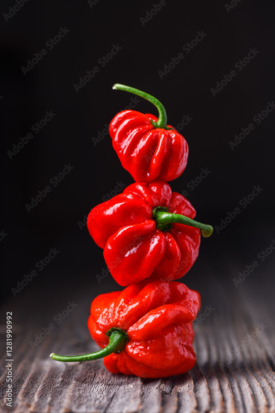 Three ripened red habanero peppers (capsicum chinense) on wooden table. Very hot mexican peppers on rustic wooden table close up