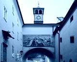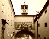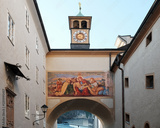 Religious fresco and bell tower with clock at Franziskanergasse near Franziskanerkloster street in the Old Town of Salzburg, Austria.