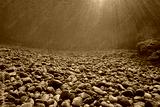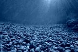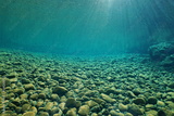 Pebbles underwater on riverbed with clear freshwater and sunlight through water surface, natural scene, Dumbea river, New Caledonia, south Pacific