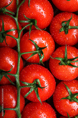 Ripe red tomatoes from organic farm with water drops on twig close up. Food photography