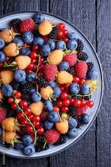 Mixed summer berries in a blue plate: blueberries, raspberries, redcurrant, blackcurrant and mulberries close up. Food photography