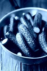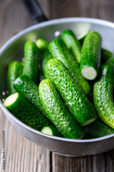 Metal colander with fresh cucumbers washed and ready for preserving. Close-up shot for food styling