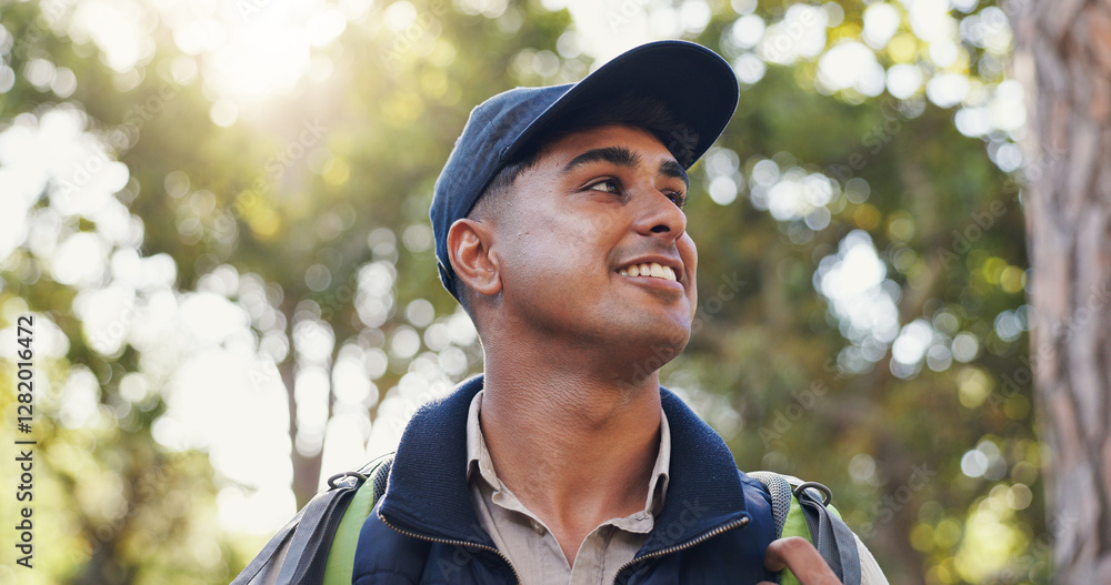 Smile, thinking and man hiking in forest of backpacking, travel adventure and environment fitness. Below, male person and trekking hobby in woods, nature survival and sightseeing on vacation activity
