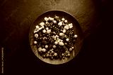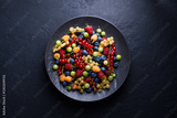 Assorted berries on black plate. Multicolored mix berries: blueberries, raspberries, redcurrant, blackcurrant and mulberries. Top view, flat lay