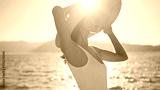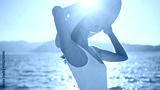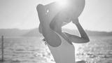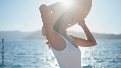Girl posing sunny coast at ocean water closeup. Woman standing on sunlight beach
