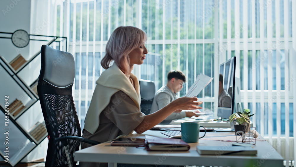 Positive woman looking documents at coworking space. Manager working at office
