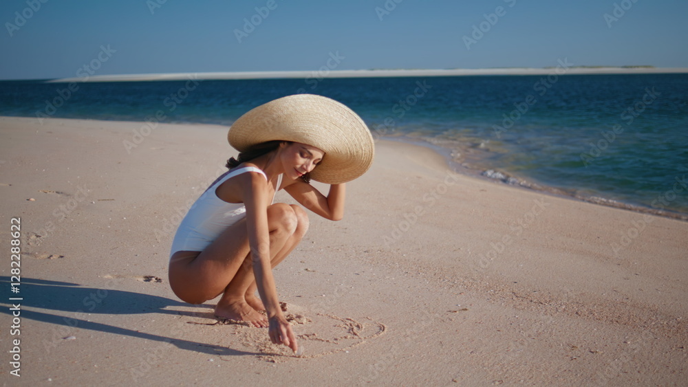 Woman drawing ocean sand enjoying summer vacation on resort. Smiling brunette