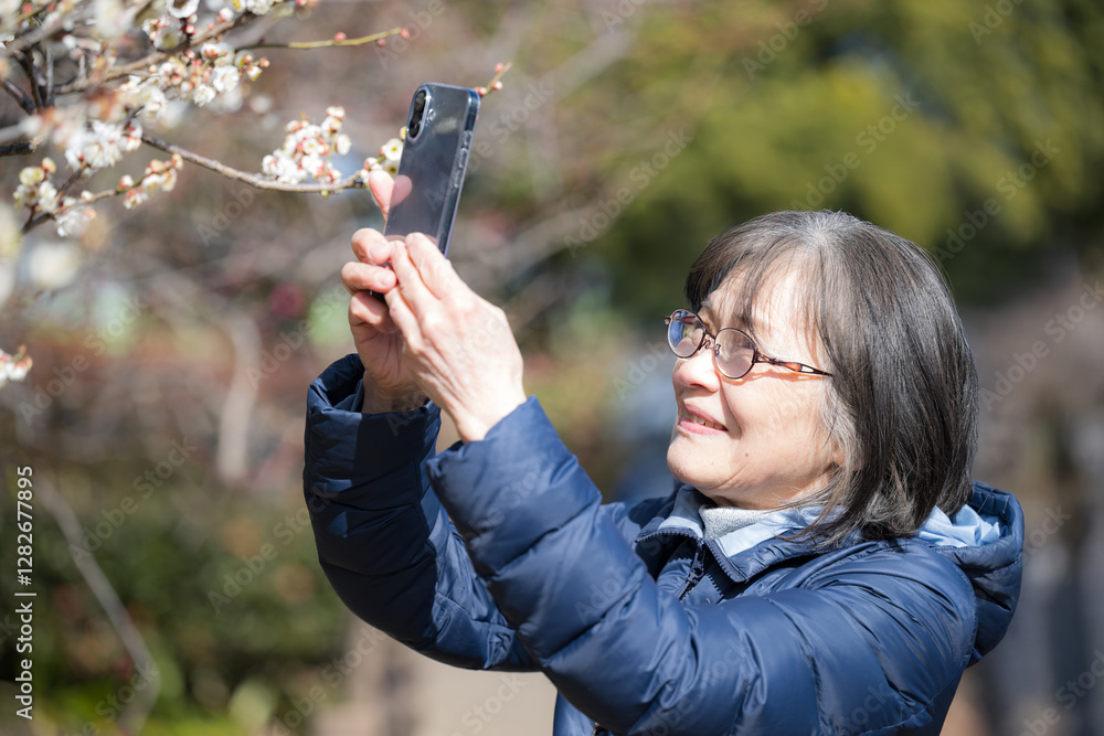 笑顔で梅の花をスマホで撮影するシニア 日本の早春のイメージ