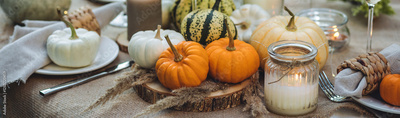 Simple craft elements, pumpkins as decoration, candles. Lunch outdoors in the garden. Cozy dinner table decor for an autumn event, countryside party, thanksgiving dinner or wedding banner