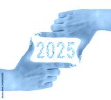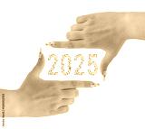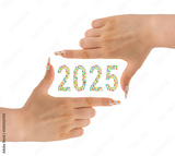 Hand of a woman with flowers nails and 2025 shaped from real colorful glass bottles in various shapes isolated on a white background