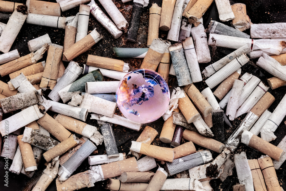 Human health concept. Lots of cigarette butts surround a crystal globe