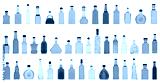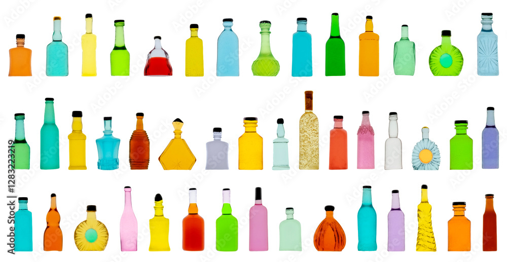 Colorful glass bottles in various shapes displayed against a transparent background for creative design purposes