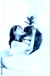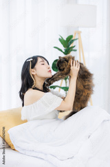 Asian happy young female sitting on white bed owner smiling hugging playing fluffy tortoiseshell cute little kitten breed pussycat pet friend in bedroom at home, Concept love animal comfort rest care.