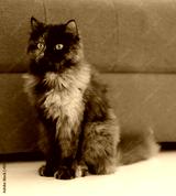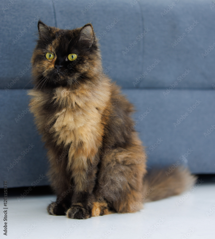 Healthy happy fluffy tortoiseshell cat breeds indoor cat. Domestic feline pet kittens enjoy playing looks at the camera sitting on floor near the cozy sofa in living room at home, Pet Animal Concept.