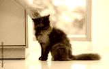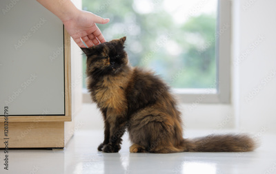 Portrait adorable happy fluffy tortoiseshell cat breeds green eyes cute funny indoors. Domestic feline pet kittens looks around sitting on floor in living room at home, Concept love for animals caring