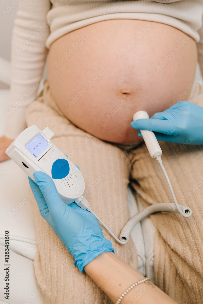 Gynecologist checks heart rate of pregnant woman on the appointment. Gynecologist listens to fetus heartbeat with fetal doppler in the clinic.