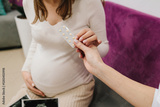 Gynecology checkup embryo health with ultrasound scan in gynecological clinic. Gynecologist prescribes prenatal vitamins and nutritional supplement to pregnant woman.
