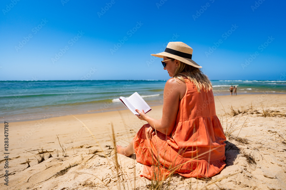 Beautiful middle aged woman in sun hat sitting on sandy beach and reading book on sunny day. Side view. Summer vacation with book