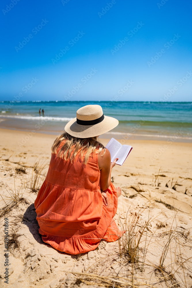Beautiful middle aged woman in sun hat sitting on sandy beach and reading book on sunny day. Back view. Summer vacation with book
