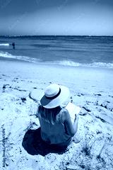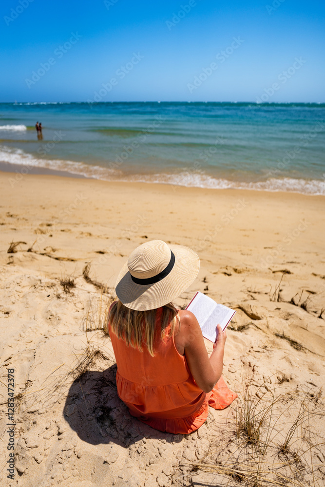 Beautiful middle aged woman in sun hat sitting on sandy beach and reading book on sunny day. Back view. Summer vacation with book