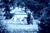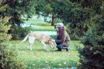 A girl and her dog (Labrador retriever) walking in a park in autumn
