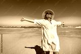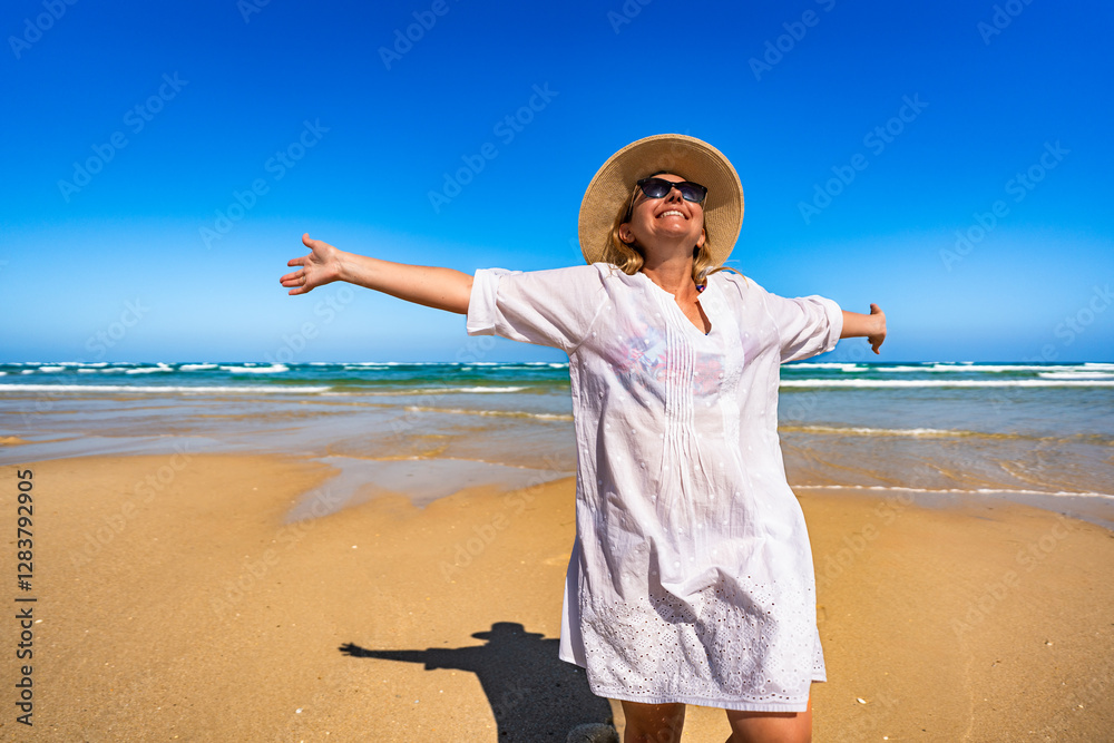 Happy middle-aged woman tourist enjoying sun and beautiful sandy beach on Armona island, Portugal. Front view