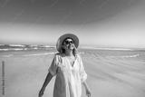 Happy middle-aged woman tourist enjoying sun and beautiful sandy beach on Armona island, Portugal. Front view