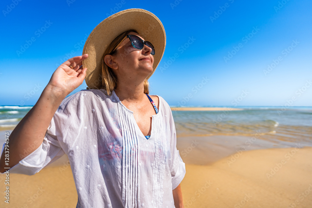 Happy middle-aged woman tourist enjoying sun and beautiful sandy beach on Armona island, Portugal. Front view