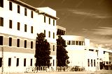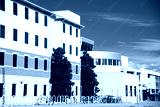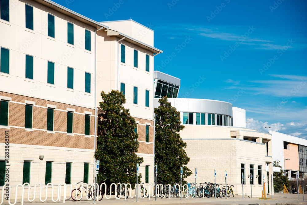 Extended long loop wave style bike rack at college campus building entrance in Dallas, Texas, modern urban architecture, green transportation ecology for students, bicycle railing, sunny blue sky