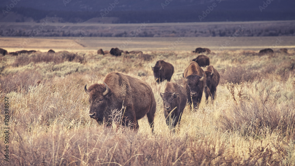 Retro toned herd of American bisons grazing in the Grand Teton National Park, Wyoming, USA.
