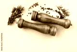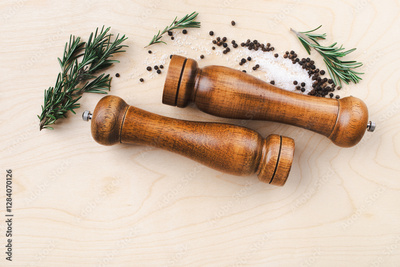 Culinary background with salt and pepper wooden mills or grinders with rosemary on the kitchen table top view.