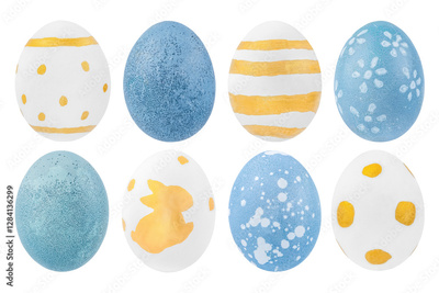 Easter eggs isolated on a white background. Handmade golden and blue Easter eggs. Easter celebration concept
