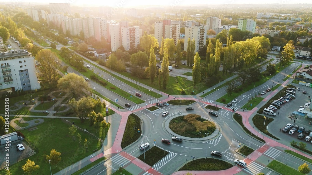 Urban landscape with roundabout and green areas