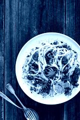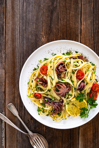 Pasta with baby octopus on wooden table