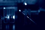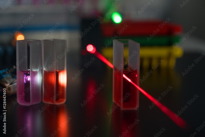 Quartz cuvette for laser chromatography with red liquid. Physical chemistry laboratory