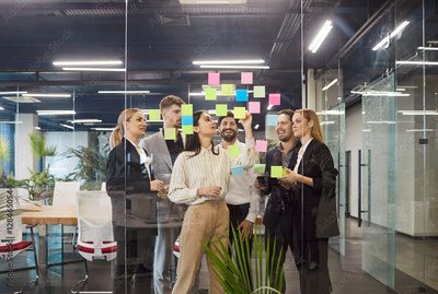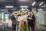 Young business people men and women posting notes and reminders in office preparing for meeting or conference. Company employees or group of staff working indoors. Corporate job concept.