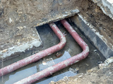 Excavation work reveals deep trenches with red pipes submerged in muddy water, illustrating the challenging conditions at a construction site in an urban area