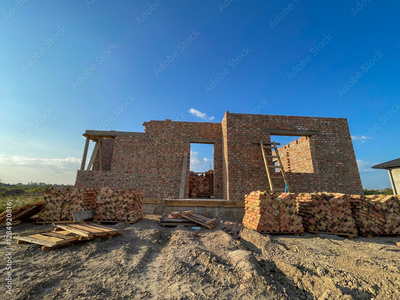 Workers are constructing a residential building as brick walls take shape beside stacked materials during the late afternoon sun